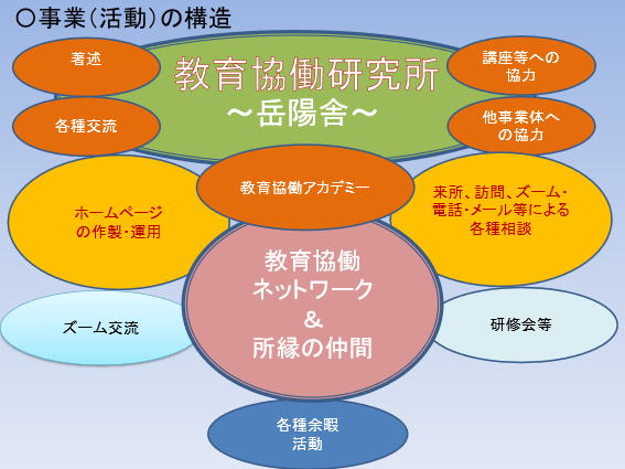・HP作成と情報提供(「『岳陽』と共に」:月2回/ 「新教育協働への道」:随時/ 「岳陽チャンネル」(新規):随時 他) ・講習・研修会等への協力(企画等も含めて)※気軽にご相談下さい! ・その他(ミニイベント?!等) |