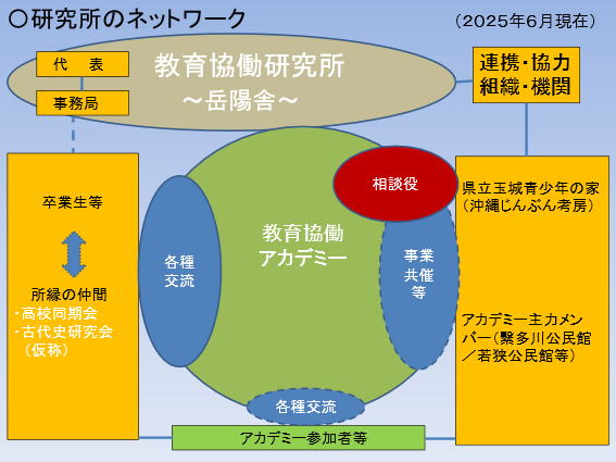 ○「生涯学習」政策・運動の最終的な着弾地を目指す! これまでの「生涯学習」政策・運動の最終的な着弾地として、「教育(ひとづくり)と地域づくり(まちづくり)の往還関係(循環構造)づくり」を着想し、「学習交流・人のネットワークづくり」、そこから生まれてくる成果・人間関係を、学校教育や社会教育の分野に活用していく。そして、そこに、「地域の教育力の再生」を含む、新たな地域活性化の方向性としての「スクール・コミュニティ」(学びの共同体)の形成を目指す「教育協働」のしくみづくりを打ち出す。これを、「地域教育経営」と呼んでいる! ○「教育協働」による、沖縄からの発信と実績づくり! 上記に基づいて、ここ沖縄の地において、これまでの様々な組織・機関等のみなさんとの、お互いの活動実践や協力関係を土台にしながら、新たな活動のヴィジョン、事業・しくみづくりを模索・構築する。そのための根拠地が「教育協働研究所〜岳陽舎〜」であり、そこから広がるネットワークが「教育協働アカデミー(旧教育協働セミナー」である。新たな「沖縄からの発信と実績づくり」、まさにこれが、いかに実現できるかである! |